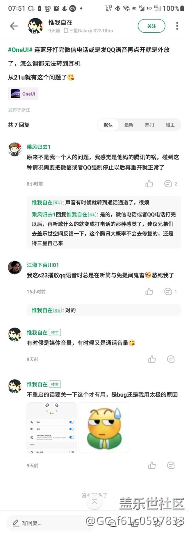 直到最近我發(fā)現(xiàn)每次觸發(fā)這個bug的好像都是微信電話結(jié)束以后,所以我嘗試把微信強(qiáng)制停止了再重新啟動,音頻果然恢復(fù)正常了,直到酷安上面看到有幾個機(jī)友都說有類似情況,真的很難受,希望能早點修復(fù)