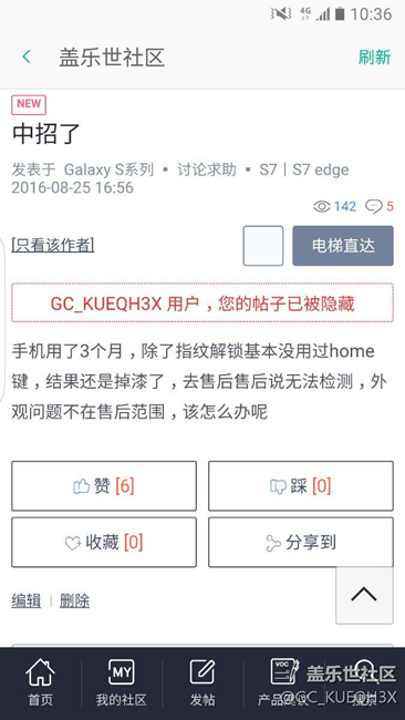 昨天發(fā)帖求助,home鍵掉漆,問(wèn)大家怎么解決的,今天上線一看,直接給我隱藏了,我就不明白了,我是黑三星了還是發(fā)帖違規(guī)了,有意思嗎