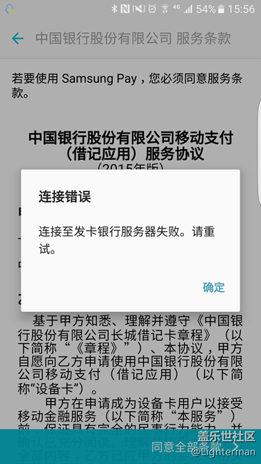 我的S7 edge在使用Samsung Pay綁定銀行卡時(shí),我的一張中行的卡始終綁定失敗,提示連接發(fā)卡行服務(wù)器失敗,而另一張工行的卡卻沒有問題。