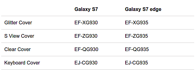 從圖中可以看出,Galaxy S7和S7 edge兩部手機(jī)各有4款官方保護(hù)套,分別是閃光保護(hù)套(Glitter Cover)、智能保護(hù)套(S View Cover)、透明保護(hù)套(Clear Cover)和鍵盤保護(hù)套(Keyboard Cover)。