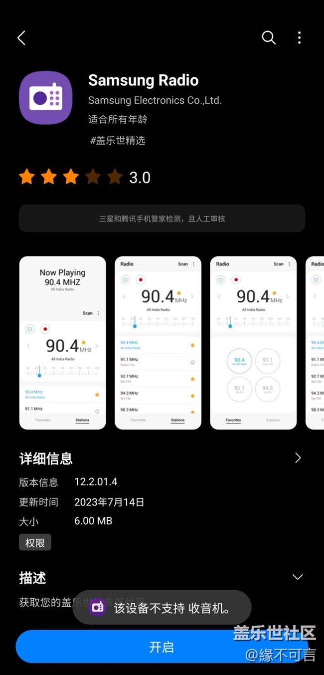 收音機安裝后提示設(shè)備不支持,無法運行。難道是硬件不支持嗎,那干嘛還上架三星應(yīng)用商店,真實謎一樣的三星。