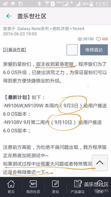 三星原發(fā)貼公告NOTE4各版本在八月內(nèi)升級(jí)安卓6.0,813升級(jí)N9100至6.0,但BUG一堆,論壇機(jī)油吵炸了,另外時(shí)至今其它版本N4尚未升6.0,三星蓋樂(lè)世論壇又被吵爆??終于在今天又發(fā)布其它版本升6.0公告??醉了醉了??