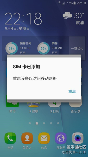 手機重啟如果沒有使用手機移動網(wǎng)絡(luò),就會出現(xiàn)如圖彈窗,必須重啟,由于不是重啟后立即彈窗,我重啟后馬上斷開wifi,再重啟就沒事了。下次連接wifi重啟還會這樣