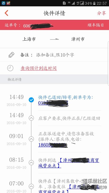 好吧,等吧,不差這幾個(gè)小時(shí)!于是跑去游泳??,過了21點(diǎn)出頭,正準(zhǔn)備去順豐,去之前點(diǎn)開了順豐快遞查詢,臥槽,什么情況,顯示已經(jīng)退回轉(zhuǎn)寄了(如圖)趕緊打快遞員電話,直到快22點(diǎn)才接(那么忙?)快遞員說是三星要求轉(zhuǎn)寄的!妹的,14點(diǎn)多就轉(zhuǎn)寄了,三星,順豐都沒通知,我自己還在那意 淫糾結(jié)那么久!看來得退了等珊瑚藍(lán)了??