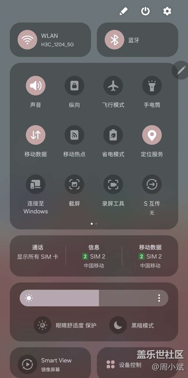 三星把亮度調(diào),護眼模式黑暗模式結(jié)合成一個模塊,設(shè)備控制和鏡像控制移到了最底端,這樣每個模塊都變的非常的清晰直觀,好評!