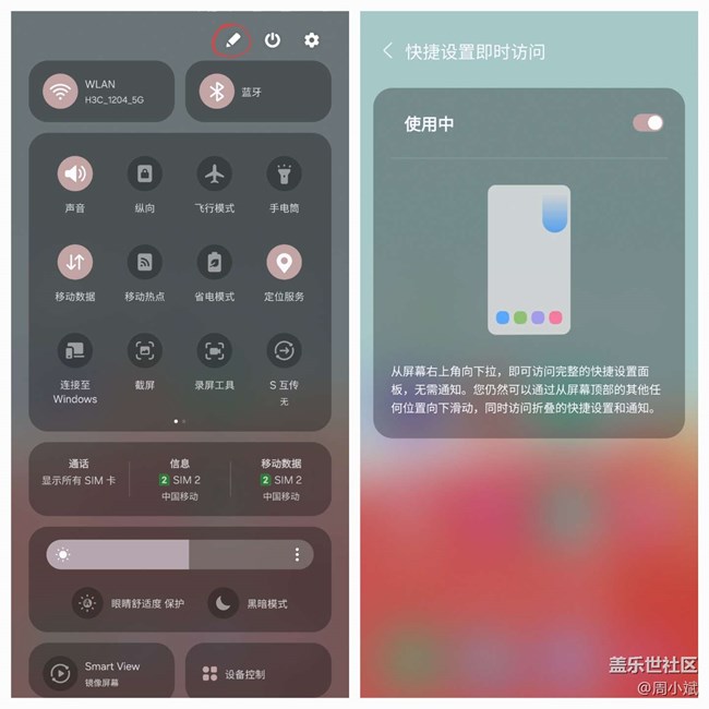 三星通知欄多了全新的手勢操作,點擊筆的標志,多了一個快捷設(shè)置即時訪問,打開后就可以靠右單指下滑能展開全部的通知欄,以前是兩次下滑或者雙指下滑才行,現(xiàn)在這個改動確實方便了很多,如果你不喜歡也可以把這個功能關(guān)閉,選擇權(quán)在您自己的手上。
