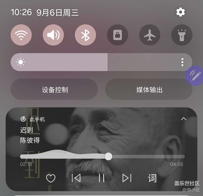三星也把通知欄的音樂視頻播放器小組件進行啊全新的設(shè)計,在播放的時候進度條變成了波浪形,給我的感覺是更加的時尚了!