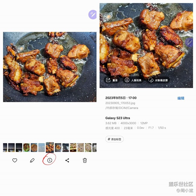 相機的升級那相冊也不例外,現(xiàn)在多了一個選項點擊一下就能顯示拍攝信息等等而且三星把重錄,人像效果,對象橡皮擦放在了這里,讓用戶能更方便的使用這些功能(不點擊這
