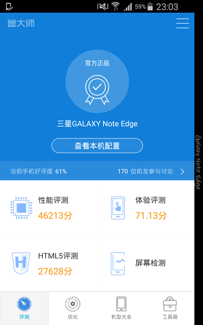 重啟手機(jī),用魯大師跑了次分,各項(xiàng)結(jié)果如下