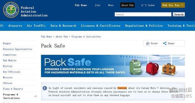事實上最早的傳播者我們不知道,但在這個互聯(lián)網(wǎng)時代想證實一件事也沒有那么難,于是小編登陸了美國聯(lián)邦航空管理局官網(wǎng),果然,在Pack Safe 一欄里看到了與三星Galaxy Note 7 有關(guān)的信息,并且也確實提到了Galaxy Note7因電池缺陷出現(xiàn)多起燃燒事故。這件事本身不是什么秘密,三星官方也并未隱瞞,而是敢于承擔(dān)責(zé)任,在全球范圍內(nèi)召回,涉及產(chǎn)品數(shù)達到250萬臺。眾所周知,航空部門對于安全問題一向非常敏感,而手機又是人們出行必備的物品,且三星在全球有著較大的市場份額,因此做出提示也是正?,F(xiàn)象。