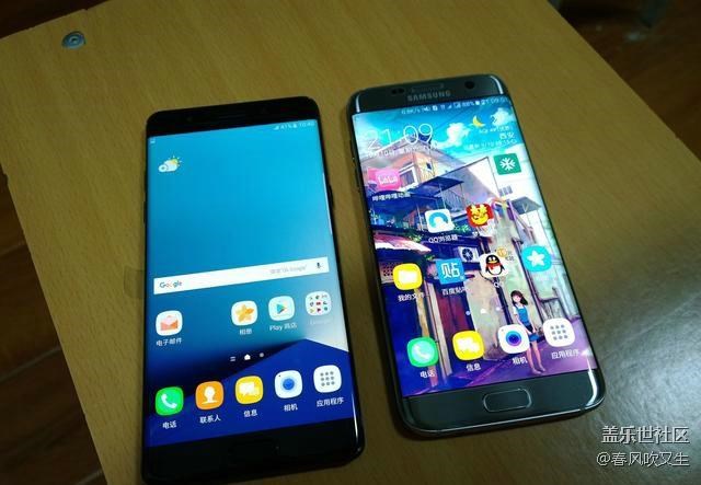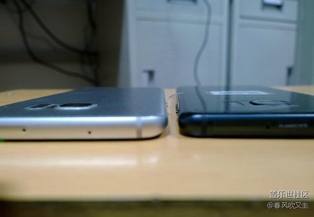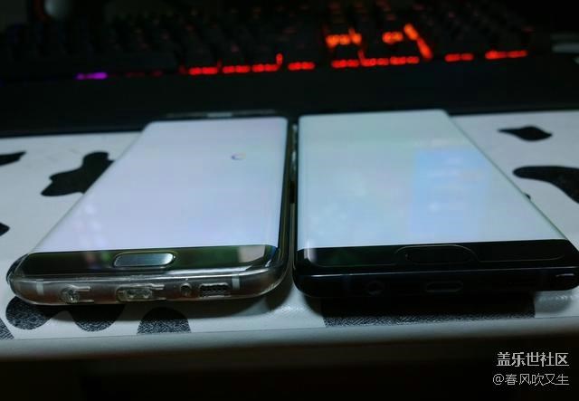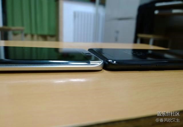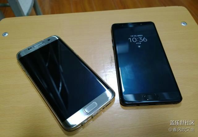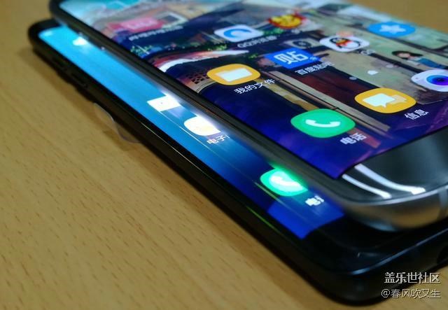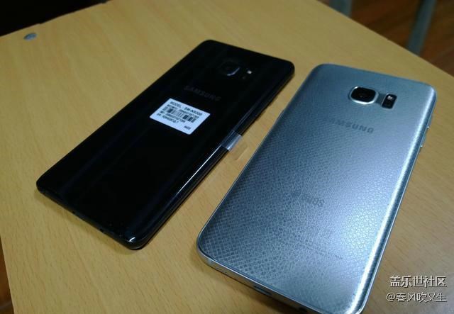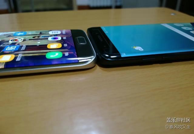 特意借了個土豪金S7e做下對比,話說這土豪金S7e長得圓嘟嘟的,真想拿它當鵝卵石打水漂。從對比來看,三星Note7的曲面弧度比s7e要小,僅僅作為裝飾用途罷了。