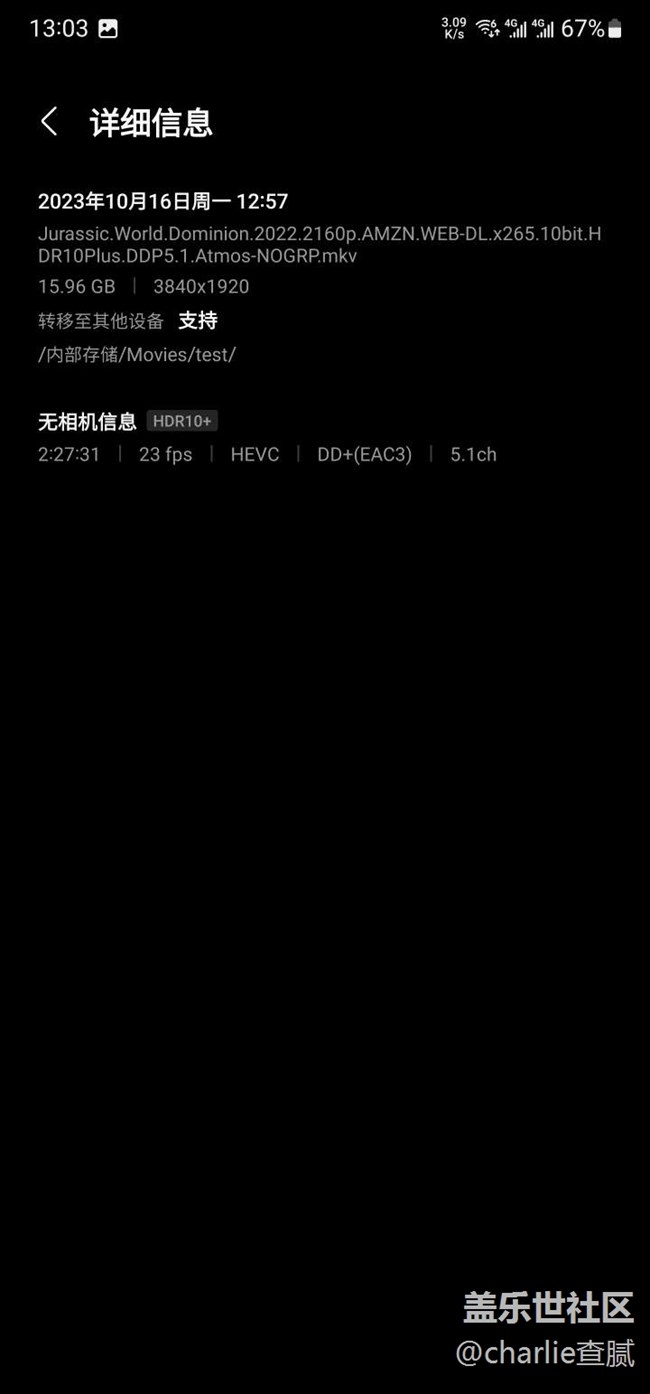 ?文件標(biāo)簽(如果你手機(jī)上有過HDR視頻并且留意過,可以發(fā)現(xiàn)在「視頻」的里面單獨(dú)的文件左下角會有一個(gè)HDR的標(biāo)簽,可以告訴你這個(gè)文件的類型,參考【圖㈣】,當(dāng)然不是說相冊里面看你就看不了HDR視頻,并不是,遇到了只要支持都是能正常播放的自動激活HDR,只不過相冊里面并不能直觀的告訴你這個(gè)就是HDR視頻。你可以打開某一個(gè)視頻以后在右上角點(diǎn)擊詳細(xì)信息,參考【圖㈤】)包括但不限于:HDR/360度視頻/DRM視頻/慢動作視頻/延時(shí)視頻