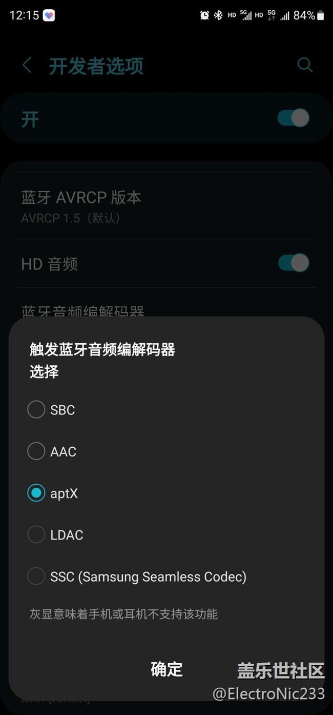 如圖,只支持最早的初代aptx,不支持aptx HD和aptx adaptive這種新無損編碼,一開始以為是我說費蘭朵有問題,結(jié)果是你,濃眉大眼的三星,偷摸縮水