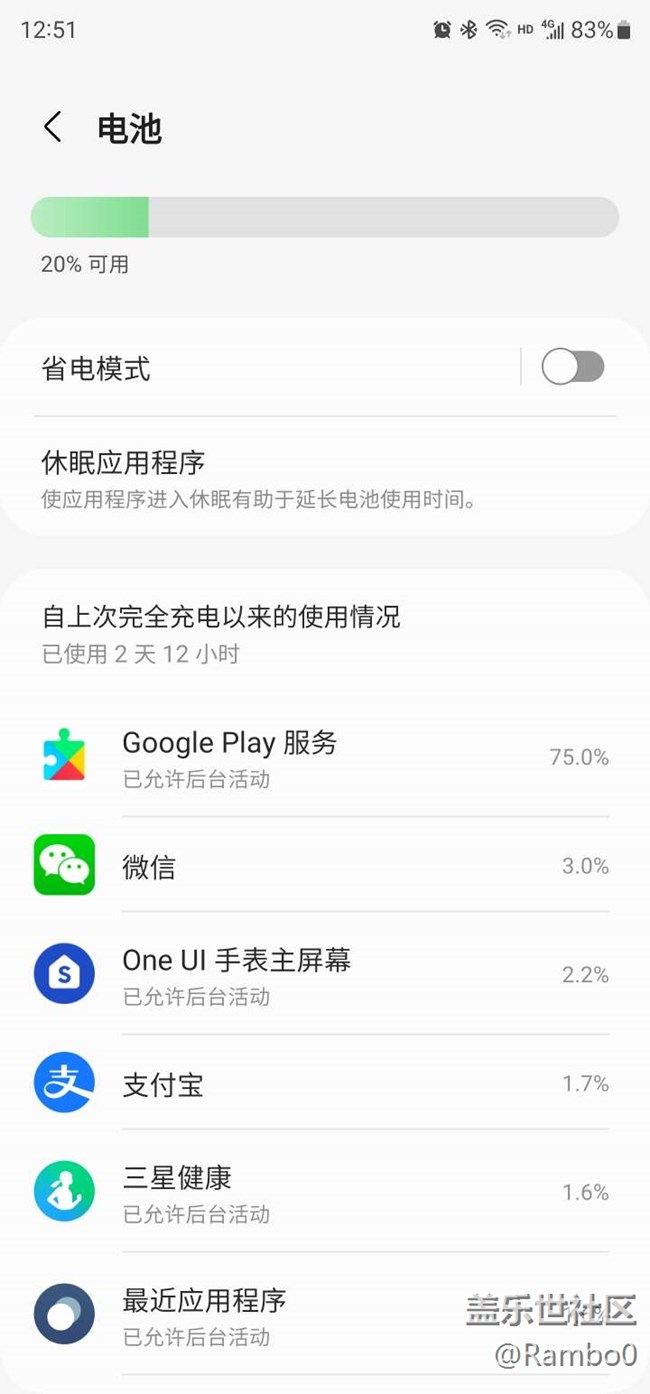 已使用2天12小時(shí),剩20%,撐到晚上睡覺前應(yīng)該問題不大。大家的續(xù)航怎么樣?電量大部分都耗在這個(gè)Google play服務(wù)上了,有辦法降低它嗎
