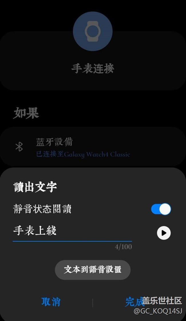 功能建議:在日常程序+中,設(shè)定為藍(lán)牙鏈接手表后讀出文字“手表已連接”的這個(gè)聲音被歸為媒體聲音欄,以至于在全關(guān)閉媒體聲音后沒有聲音,而且在日常使用中大部分情況下媒體聲音都在50%以下,此時(shí)這個(gè)語音通知聲音過小。故建議將此程序涉及的讀出通知音量歸到bixby或者通知、系統(tǒng)模塊中。