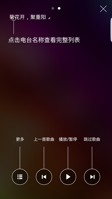 另外,點擊左上角電臺名稱,可以查看完整的電臺列表。下方為播放控制,可以進行播放操作。
