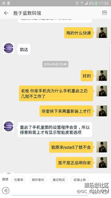 前一陣子,天貓入手一個(gè)note7鏡面套,發(fā)現(xiàn)重啟手機(jī)后就不起作用了,非要把手機(jī)重新拆下再裝回去才能用,不知道買了鏡面套的朋有沒有這個(gè)情況,之前note5的鏡面套就不會(huì)出現(xiàn)這情況。