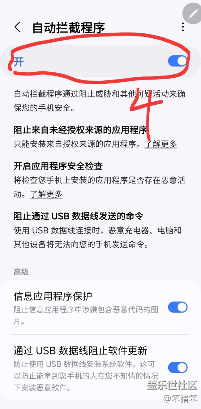 新系統(tǒng)6.0的安全性更高了,所以系統(tǒng)安全機(jī)制,只接受應(yīng)用商店審核過得程序安裝或更新。這就會出現(xiàn)大版本更新后,很多我們經(jīng)常用的軟件廠商,沒有及時按照三星安全要求更新版本,所以在三星安全機(jī)制下是默認(rèn)不讓安裝此類程序。因此我們要在確認(rèn)您要安裝的程序是正規(guī)的、合法的,就可以用以下方式暫時性關(guān)閉系統(tǒng)自帶的“自動攔截程序”,安裝完成后建議重新開啟“自動攔截程序”。在此感謝社區(qū)你的“GC_WDSRW59W”大佬指導(dǎo)。