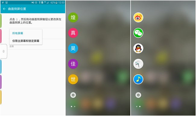 首先就是對雙曲面的設(shè)置,在主屏幕邊緣位置有一小塊白條,將它往屏幕中央滑就可以呼出曲面設(shè)置欄,默認是在所有的界面都顯示這一白條,當(dāng)然也可以通過設(shè)置讓白條只出現(xiàn)在主屏和鎖屏界面,小白條的位置也可以更改。