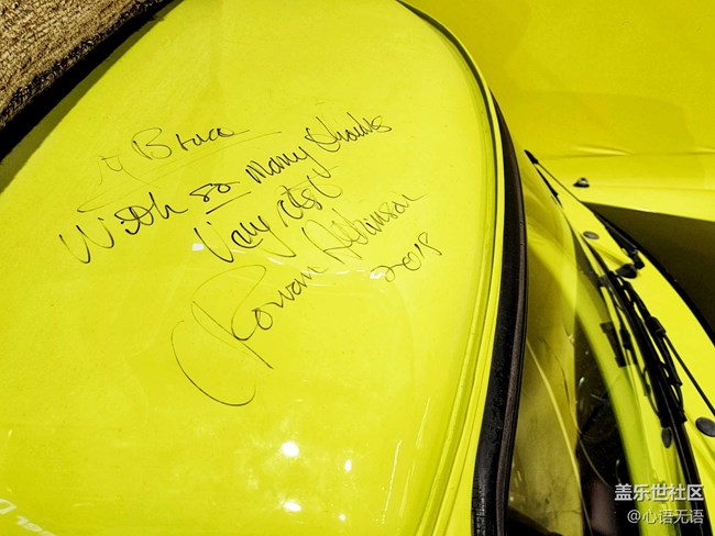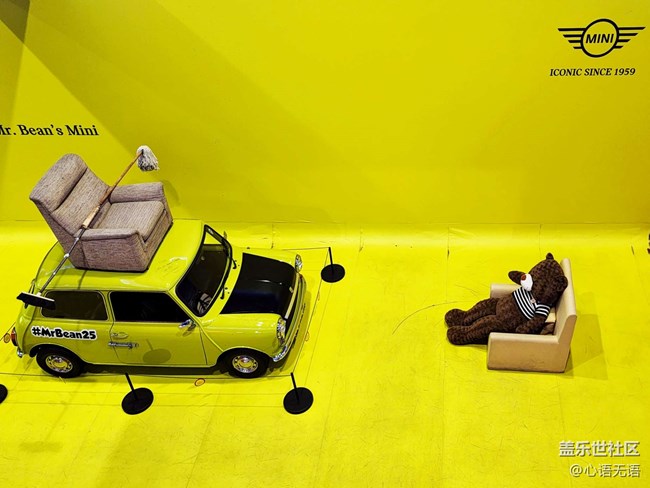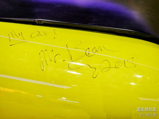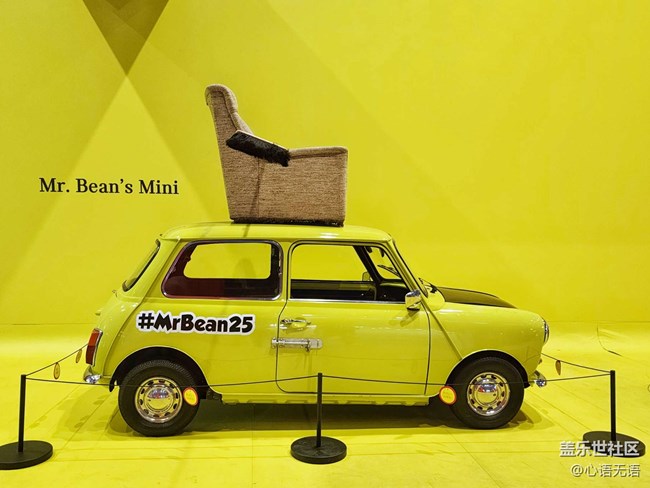 在這個(gè)展覽真的有兩輛真實(shí)的mini車哦,這件這輛黃色的是憨豆先生開過的,旁邊還有一個(gè)可愛的熊,大家可以和他們拍照留念,在車的上面,還有憨豆先生的親筆簽字哦。