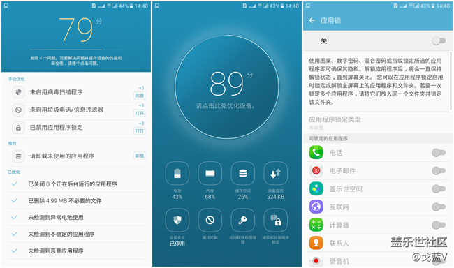 新版的智能管理器,也不容錯過。限制自啟,清理內(nèi)存,防御病毒和應用鎖一應俱全。