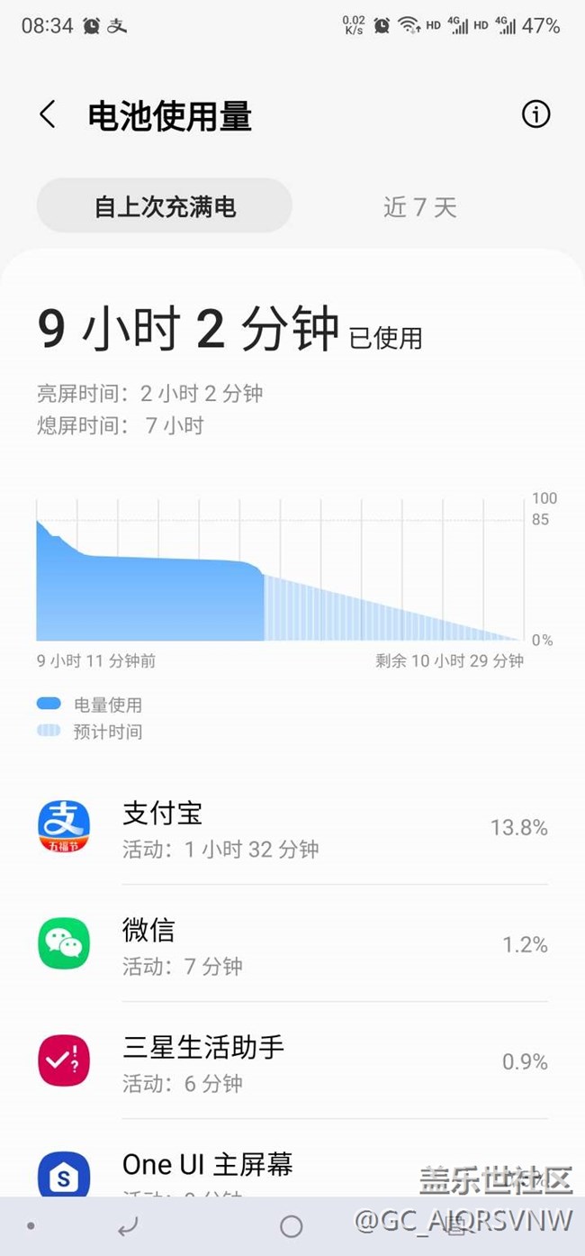 待機(jī)7小時(shí),亮屏2小時(shí)左右,耗電量85-47=38%