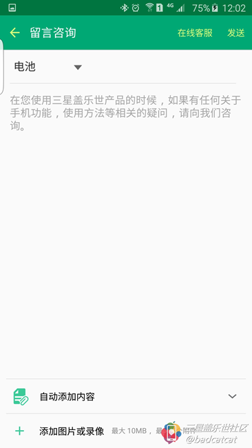 點(diǎn)選了建議反饋之后會(huì)出現(xiàn)一個(gè)調(diào)查窗口,方便大家把對(duì)三星的建議以及使用過(guò)程中遇到的問(wèn)題報(bào)告上去,方便三星進(jìn)一步改善自己的產(chǎn)品。造福廣大蓋星人。
