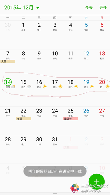 2、日歷中顯示7日天氣,但是也是要到天氣那里更新一下,否則日歷那里也是不顯示7日天氣。如下圖: