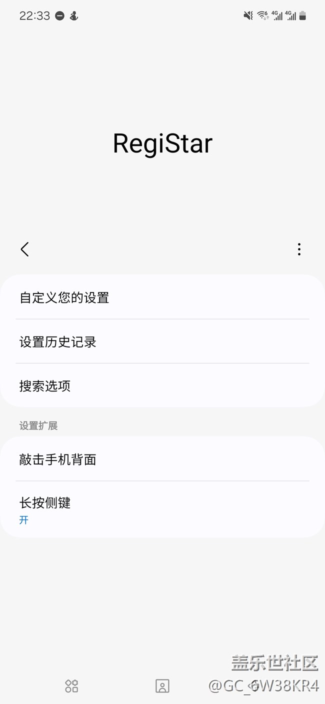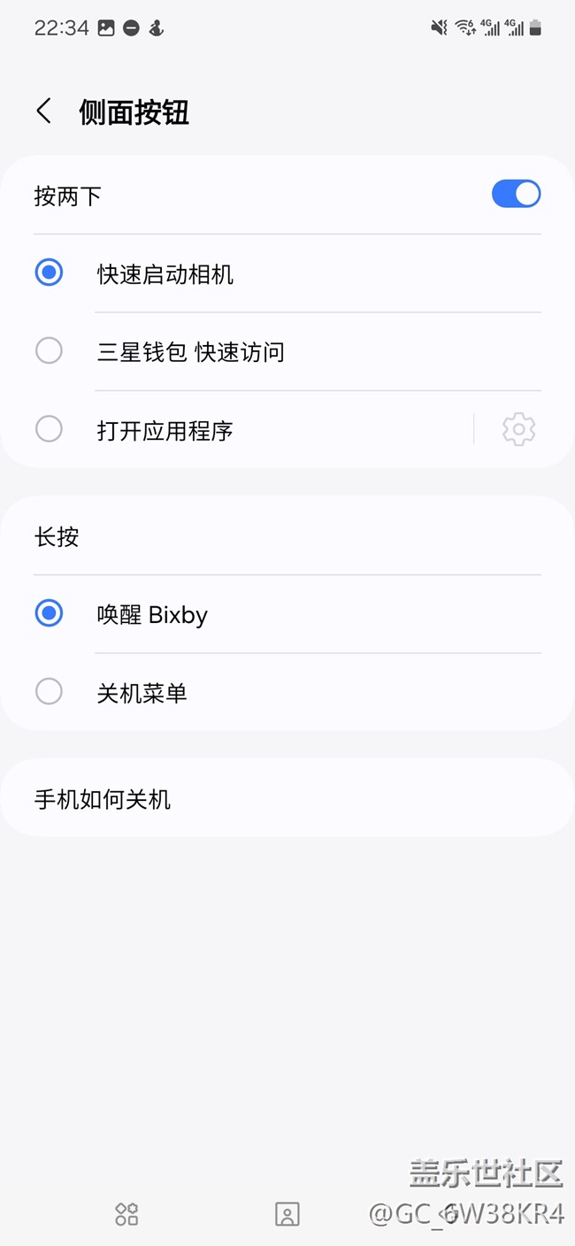 升級(jí)完后從下拉菜單進(jìn)入關(guān)機(jī)菜單多了個(gè)「?jìng)?cè)鍵選項(xiàng)」,但只能選擇啟動(dòng)bixby或關(guān)機(jī),和Good Lock里面的RegiStar的長(zhǎng)按啟動(dòng)指定應(yīng)用程序有沖突。導(dǎo)致我更新了系統(tǒng)以后沒有辦法能夠像以前一樣長(zhǎng)按啟動(dòng)app。
