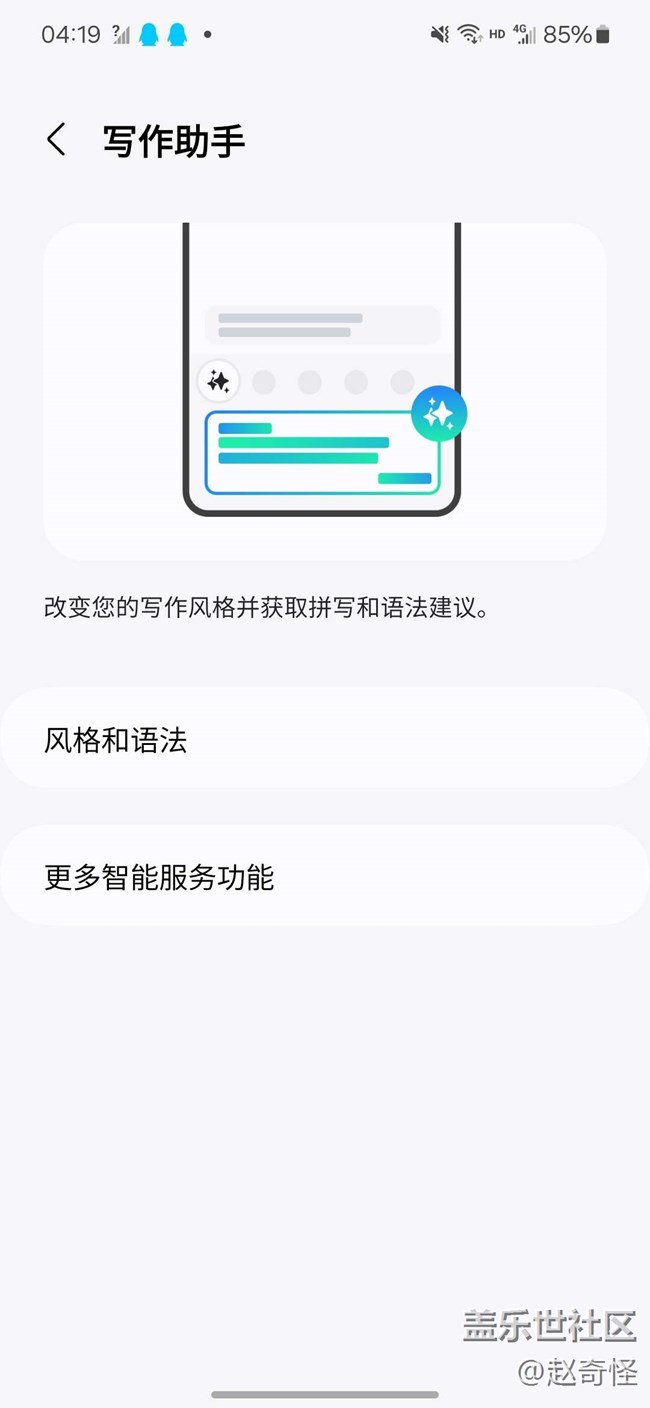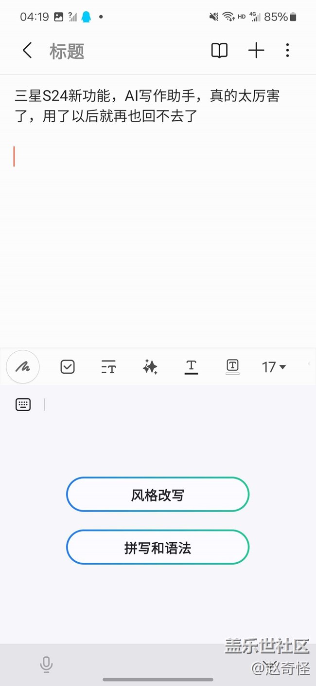 三星S24新功能,AI寫作助手,真的太厲害了,用了以后就再也回不去了,當(dāng)我們用系統(tǒng)自帶的輸入法時(shí),最右側(cè)會(huì)有一個(gè)智能按鍵,里藏著非常實(shí)用寫作助手功能,它可以對(duì)所寫的文字進(jìn)行風(fēng)格改寫,而且還有多種風(fēng)格可選,可以根據(jù)相應(yīng)的風(fēng)格改寫成對(duì)應(yīng)語(yǔ)氣的文案,不僅如此還可以檢查語(yǔ)句的拼寫和語(yǔ)法,如果出現(xiàn)錯(cuò)別字或者語(yǔ)句不通順都可以標(biāo)注出來(lái)
