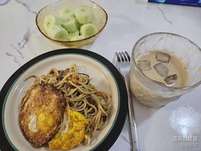 意面配煎蛋   咖啡配黃瓜。