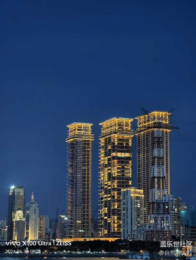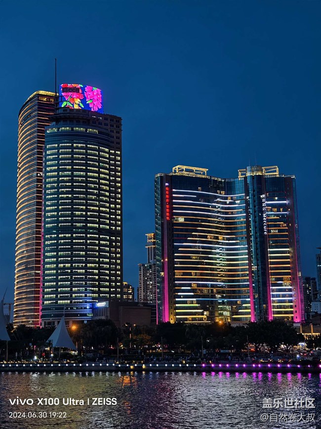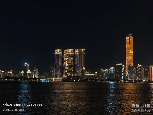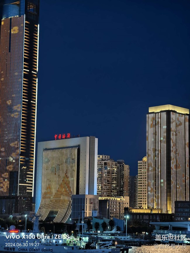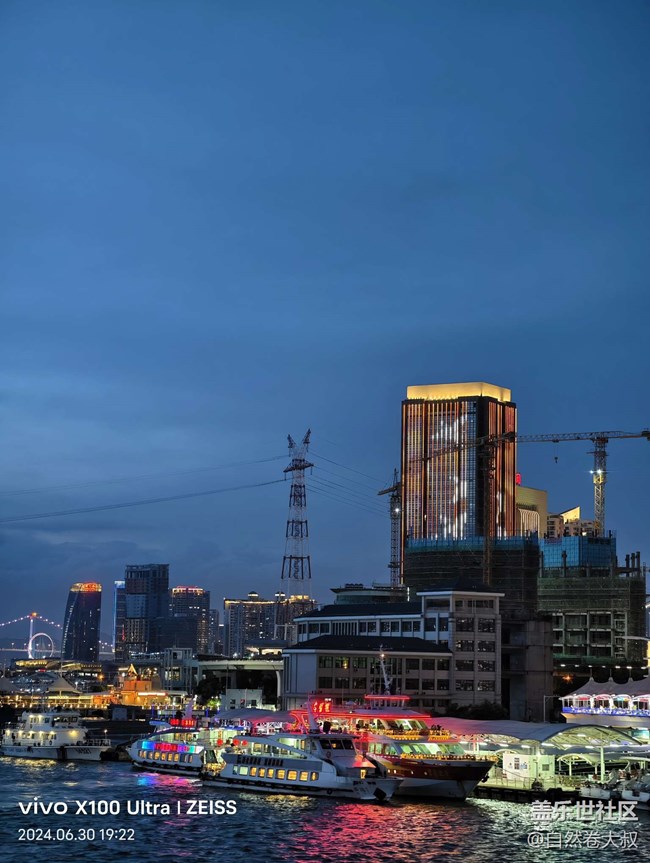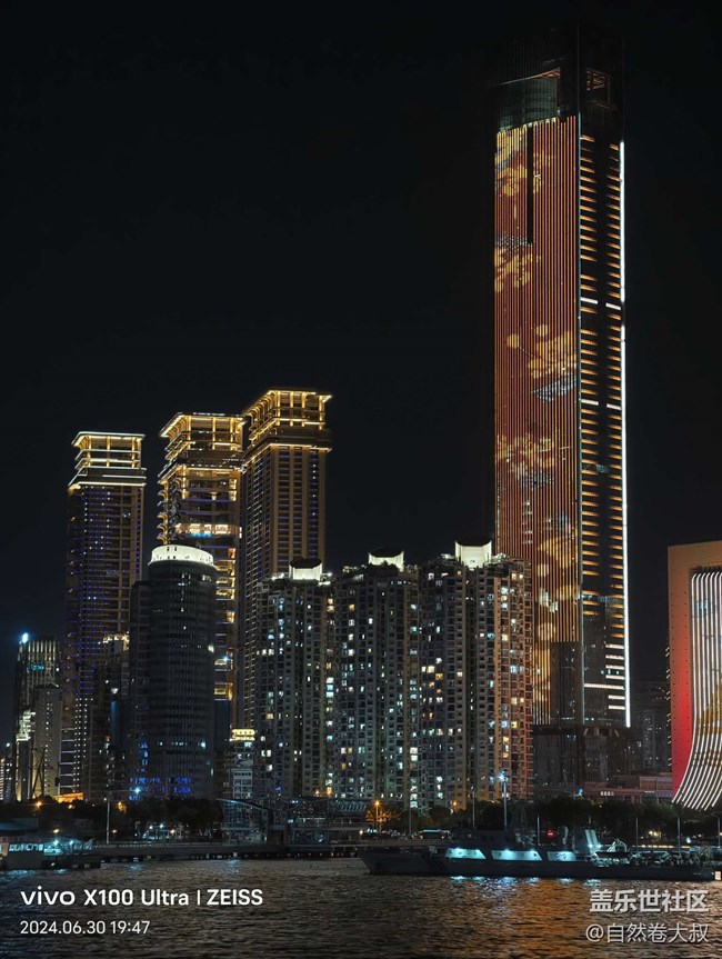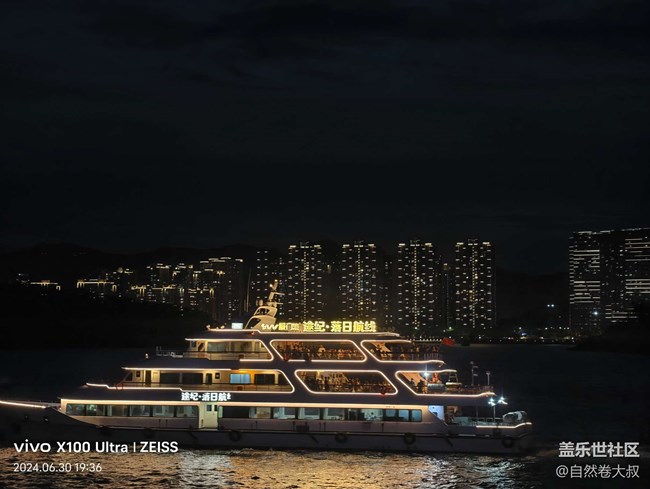 在這次拍攝活動中,有趣的是,現(xiàn)場有伙伴帶了 vivo X100 Ultra 來進行夜景拍攝。在對比之下,三星設備對于色彩的還原度非常出色,尤其是在拍攝郵輪上的燈光和城市燈火時,色彩鮮艷且準確,畫面細節(jié)豐富。