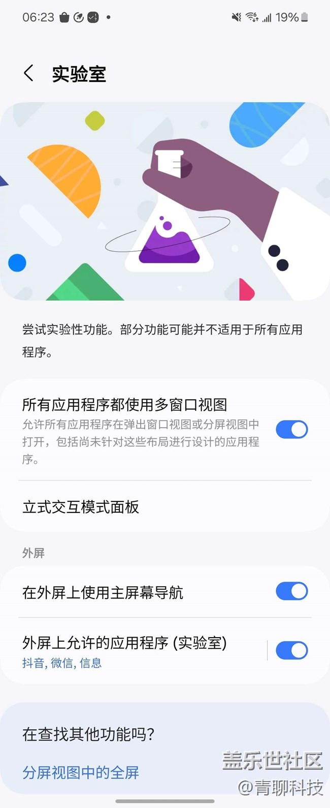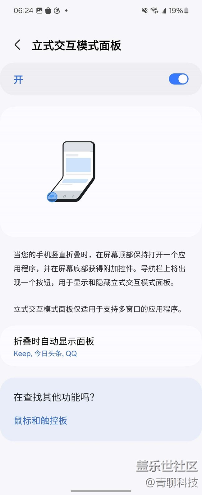 三星Galaxy Z Flip5在功能實驗室找到這個功能,開啟就可以,還能選擇開啟的應(yīng)用,我覺得全選就可以,這樣任何APP界面,手機在半折狀態(tài)下,不僅僅可以當支架使用,同時還能充當觸控板使用。