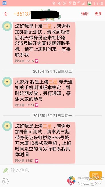 最后,于2015年12月21日收到最后一條短信,通知了最新的領(lǐng)取時間,短信最后加上了一句“上班時間沒空的請另行聯(lián)系我具體時間”。樓主我心想,也許三星UT部門有所改進(jìn)了。于是,又一次致電相關(guān)人員,結(jié)果對方稱信號不好,掛了電話。之后,就再沒有過主動回?fù)茈娫捖?lián)系。2015年12月24日,在參加完三星新A系列北京發(fā)布會回上海后,再次致電相關(guān)人員,本想預(yù)約周六領(lǐng)取測試機(jī),結(jié)果再次被無情的拒絕,“北京UT部門人多,所以雙休日加班,可以讓你們雙休日去領(lǐng)手機(jī)。上海就我一個人,雙休日不加班的”,另說樓主我不能參加測試,她會和上面匯報的。態(tài)度在樓主看來也并非友善。