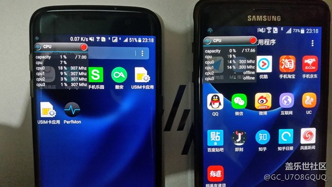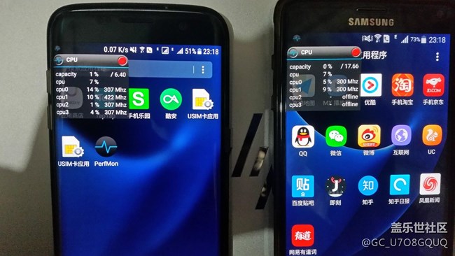 大家從下面的截圖中可以看到S7 Edge(左)和Note4(右)在桌面待機下CPU的運行情況,兩部手機后臺都掛有輸入法和微信,在桌面待機時S7 Edge的4顆核心都處于在線運行狀態(tài),而Note4的4顆核心中有2顆處于運行狀態(tài),2顆處于離線狀態(tài)(之前用的S5和Note4情況一樣)。因為我手上只有這兩部手機可用于測試,無法確定這種情況屬于個例還是普遍現象,有條件的機友可以花上幾分鐘測試一下然后回復到帖子里,如果確認這種情況屬于BUG,希望版主能夠反饋給上級部門,讓系統更加完善!