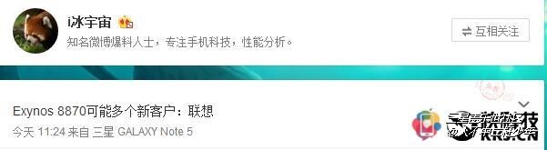 不過,魅族這邊還沒確定,突然半路殺出個(gè)程咬金。微博用戶@i冰宇宙 爆料說,Exynos 8870可能會(huì)多一個(gè)新客戶——聯(lián)想。