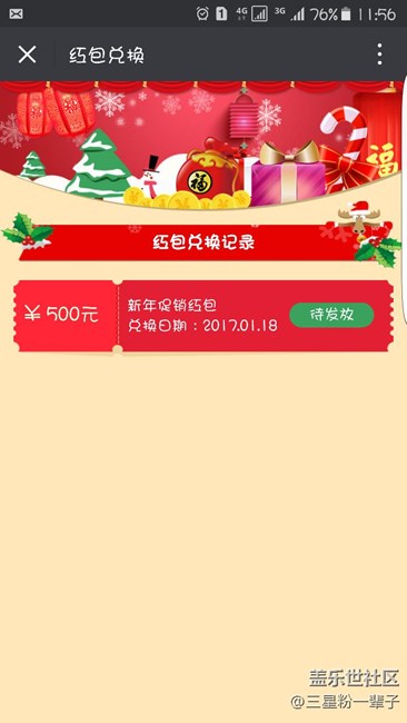 中了曬新年紅包,居然一直不知道,還好今天早上看了一下,三星還提醒了2次,希望三星快點把500塊錢紅包給我