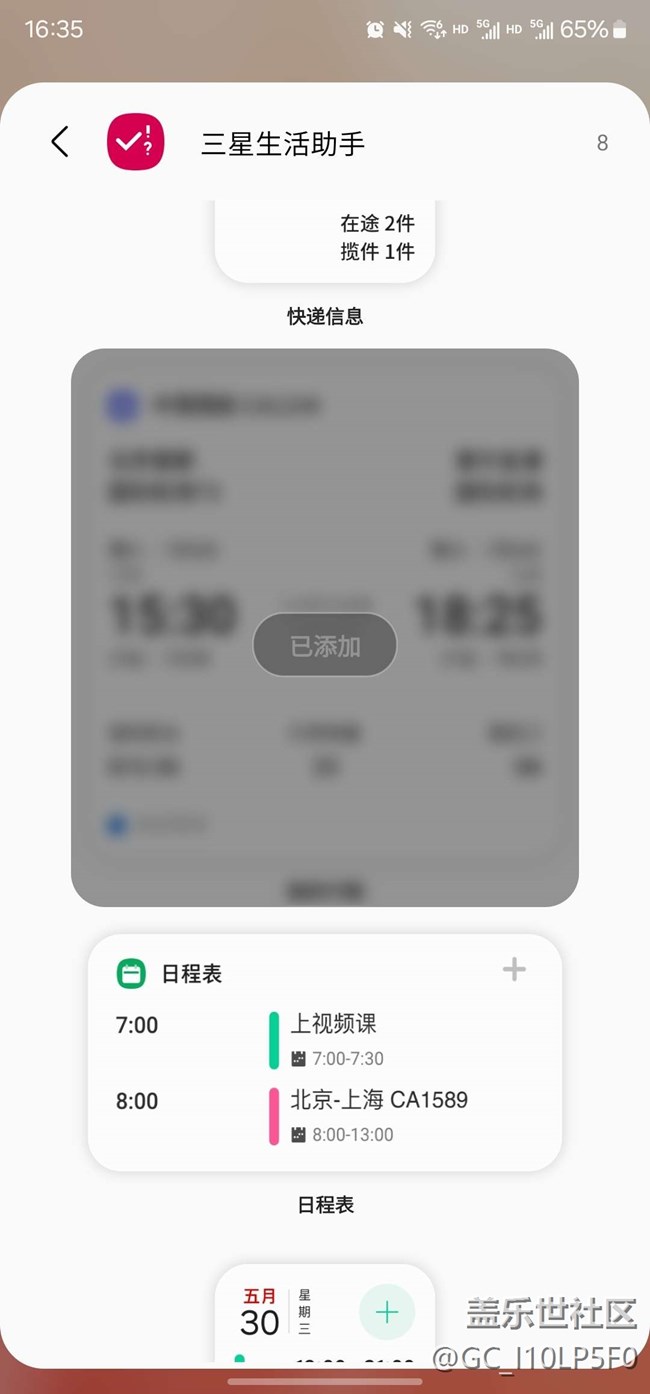 三星生活助手中我的行程卡片顯示已添加,但是負一屏沒有顯示