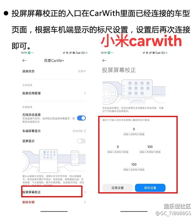 1、建議優(yōu)化屏幕矯正功能,我的三星車聯(lián)連接后無法全屏,這其實(shí)是車商和廠商分辨率適配的原因,carlife是支持【屏幕矯正】功能,可以對(duì)分辨率進(jìn)行微調(diào),但原生不太好用需要反復(fù)調(diào)試才行,建議參考小米carwith的操作更友好