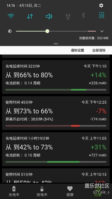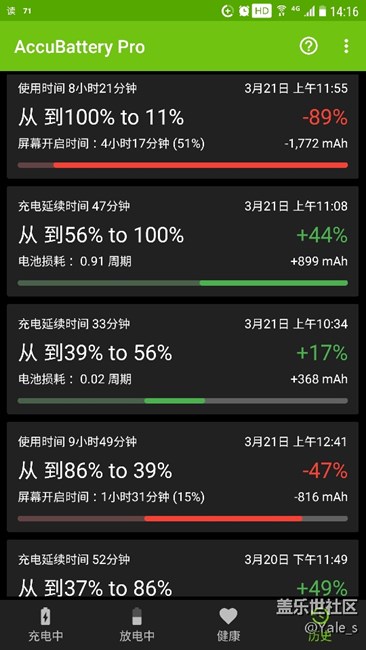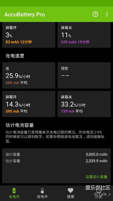 關(guān)閉快速充電!電池電量增加。因為之前本人手機在快速充電時手機發(fā)出不規(guī)則電流聲,讓我有點怕(可看我以前發(fā)的貼),所以改用了普通充電,然后用時明顯感覺電量有提升,馬上就把AccuBattery開起來測試(已經(jīng)關(guān)了一段時間了)。以前測出來電量是2000出頭,今天沖了2次電,測出來有2339了,不多說看圖。第一張是上個月的。(系統(tǒng):s7,7.0,QC4)