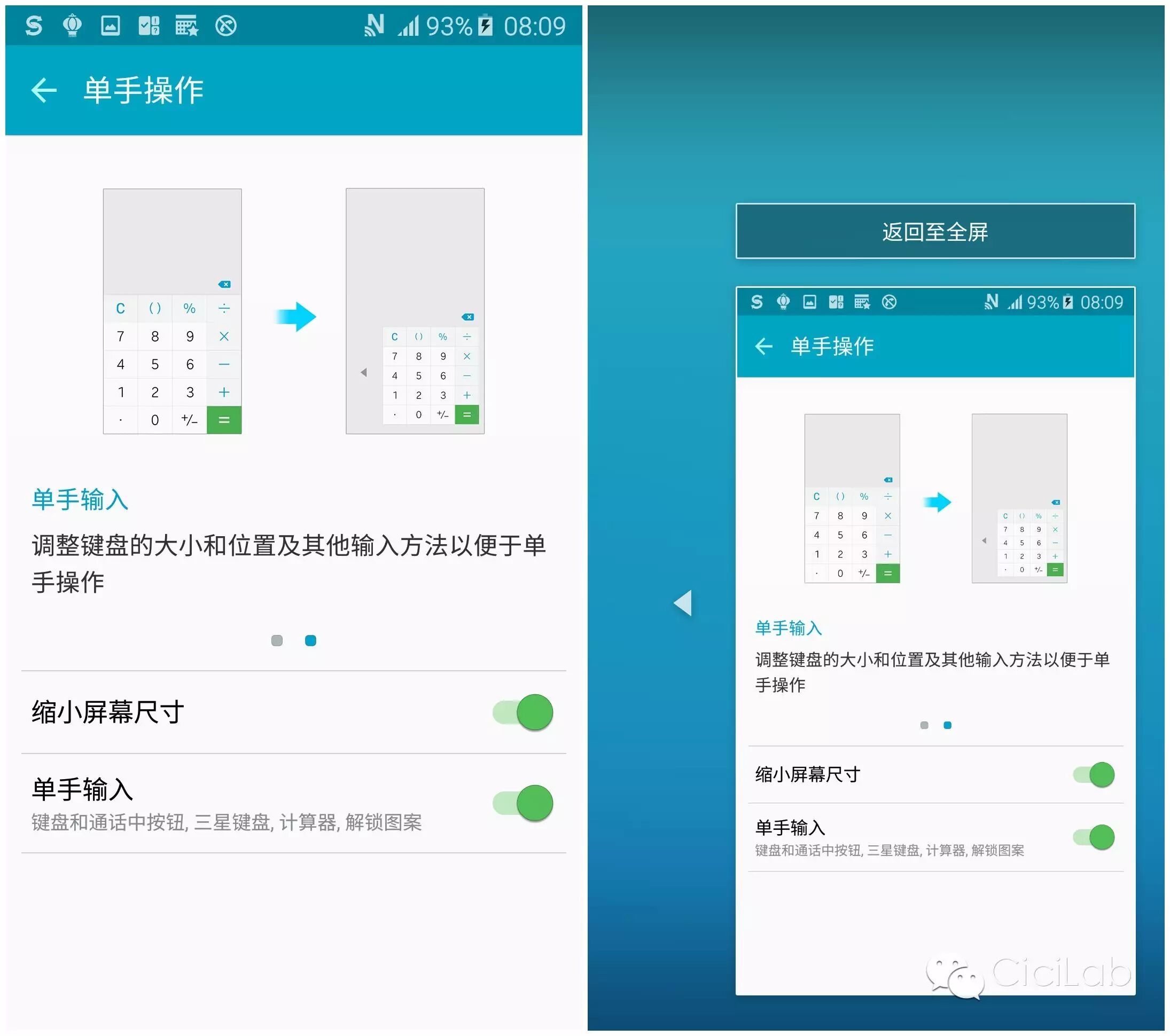 而在單手關(guān)照里還可以在對應(yīng)的設(shè)置里打開“縮小屏幕尺寸”來實現(xiàn)(還記得vivo Xplay嗎?它好像是該功能的最初作者呢。),打開該功能后三擊Home鍵就可以進入小屏幕界面,終于可以矯情一下了,畢竟偶爾應(yīng)急處理來說還是非常有用的。而第二個“單手輸入”選項則是把對應(yīng)的撥號鍵、自帶鍵盤、自帶計算器、解鎖圖案直接進行縮小,方便單手操作。