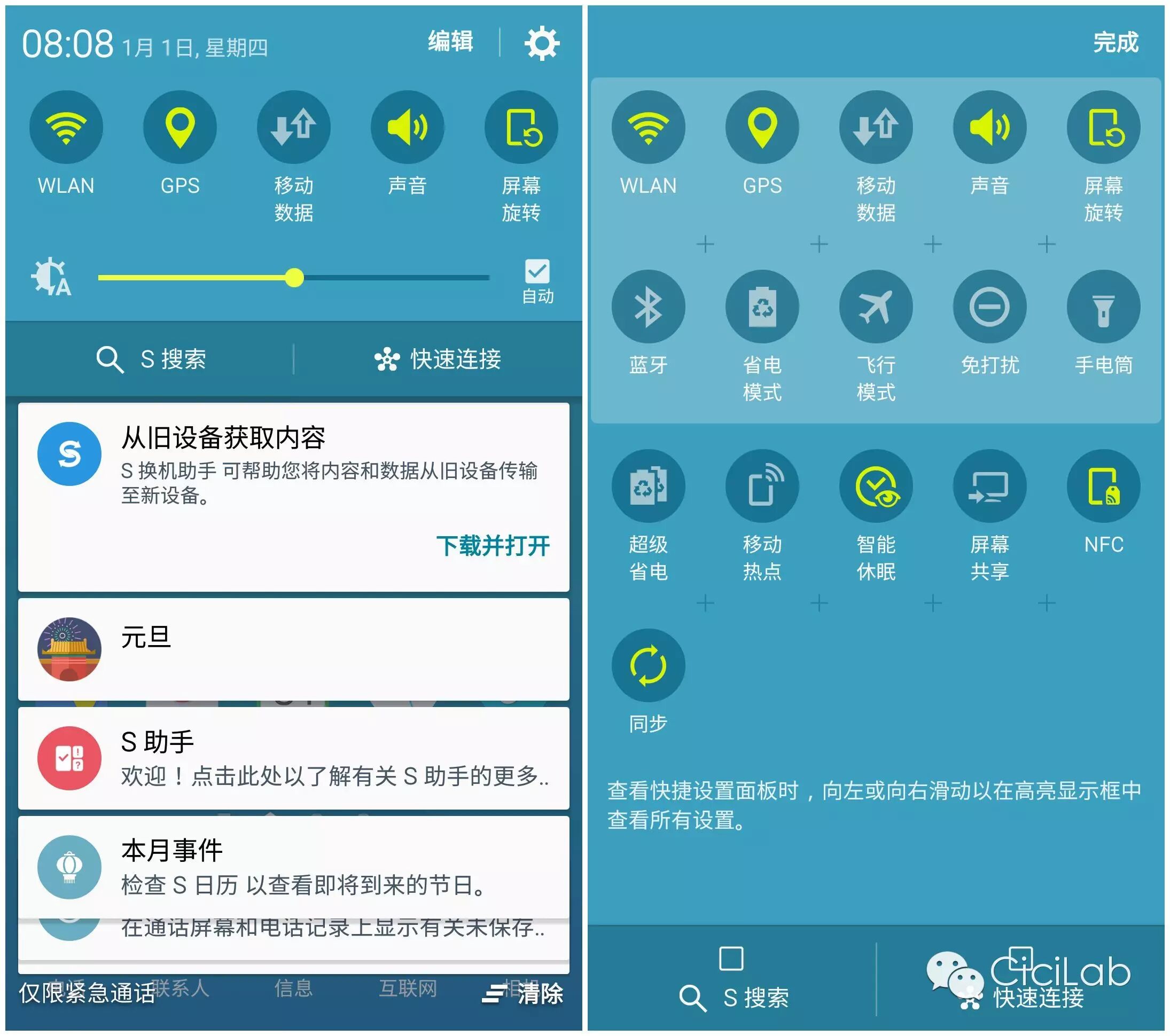下拉界面還是很熟悉的,跟大多數(shù)國產(chǎn)UI不同, TouchWiz要呼出下拉菜單只能通過頂部向下劃動,而不是“在桌面隨意一個地方向下劃都可以”,對于6英寸屏幕來說想要看通知,作為一個手掌不大的人來說就得兩只手上陣,再慌也沒用。