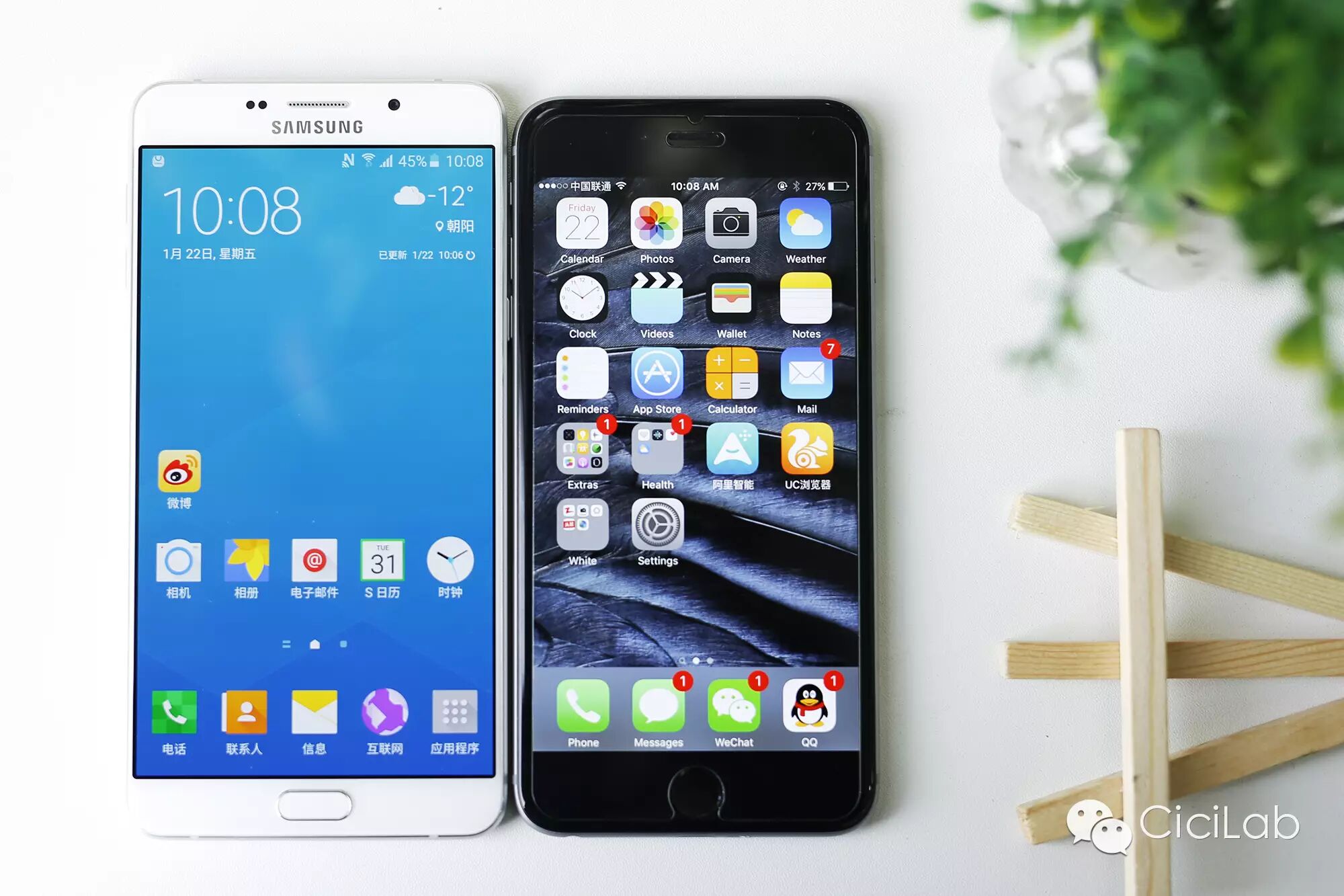方面三星Galaxy A9(左)與iPhone 6 plus(右)大小對比,A9是6英寸的屏幕