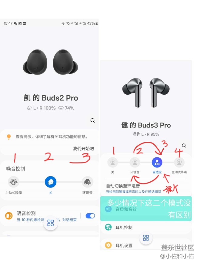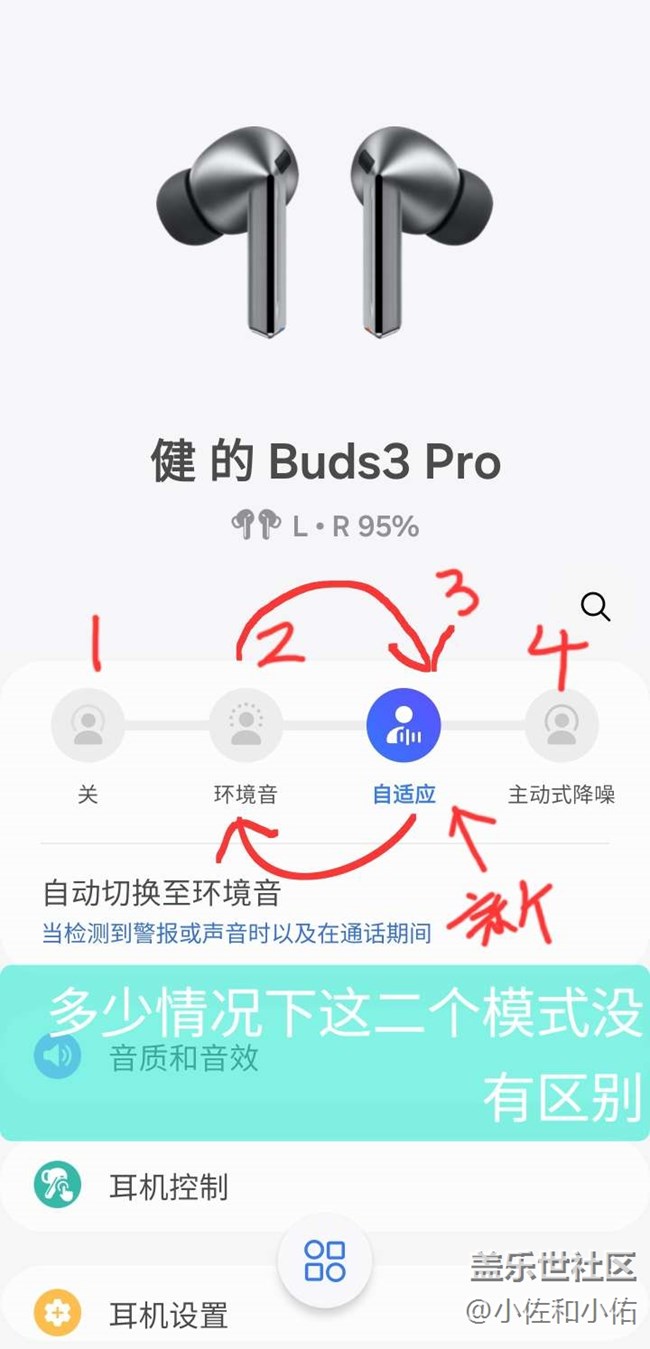 ? 耳機(jī)模式: buds 3pro 多一個自適應(yīng),在安靜的環(huán)境(室內(nèi)或者馬路上)與環(huán)境音效果一致,在地鐵上表現(xiàn)較為突出,能隔離噪音但是能聽到廣播。