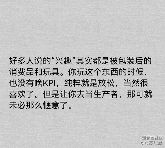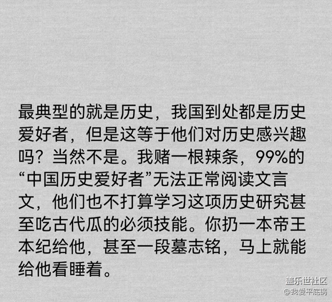 好多人說(shuō)的“興趣”其實(shí)都是被包裝后的消費(fèi)品和玩具。你玩這個(gè)東西的時(shí)候,也沒(méi)有啥KPI,純粹就是放松,當(dāng)然很喜歡了。但是讓你去當(dāng)生產(chǎn)者,那可就未必那么愜意了。最典型的就是歷史,我國(guó)到處都是歷史愛(ài)好者,但是這等于他們對(duì)歷史感興趣嗎?當(dāng)然不是。我賭一根辣條,99%的“中國(guó)歷史愛(ài)好者”無(wú)法正常閱讀文言文,他們也不打算學(xué)習(xí)這項(xiàng)歷史研究甚至吃古代瓜的必須技能。你扔一本帝王本紀(jì)給他,甚至一段墓志銘,馬上就能給他看睡著。