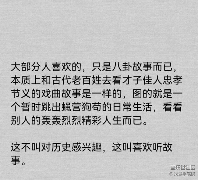 大部分人喜歡的,只是八卦故事而已,本質(zhì)上和古代老百姓去看才子佳人忠孝節(jié)義的戲曲故事是一樣的,圖的就是一個(gè)暫時(shí)跳出蠅營(yíng)狗茍的日常生活,看看別人的轟轟烈烈精彩人生而已。