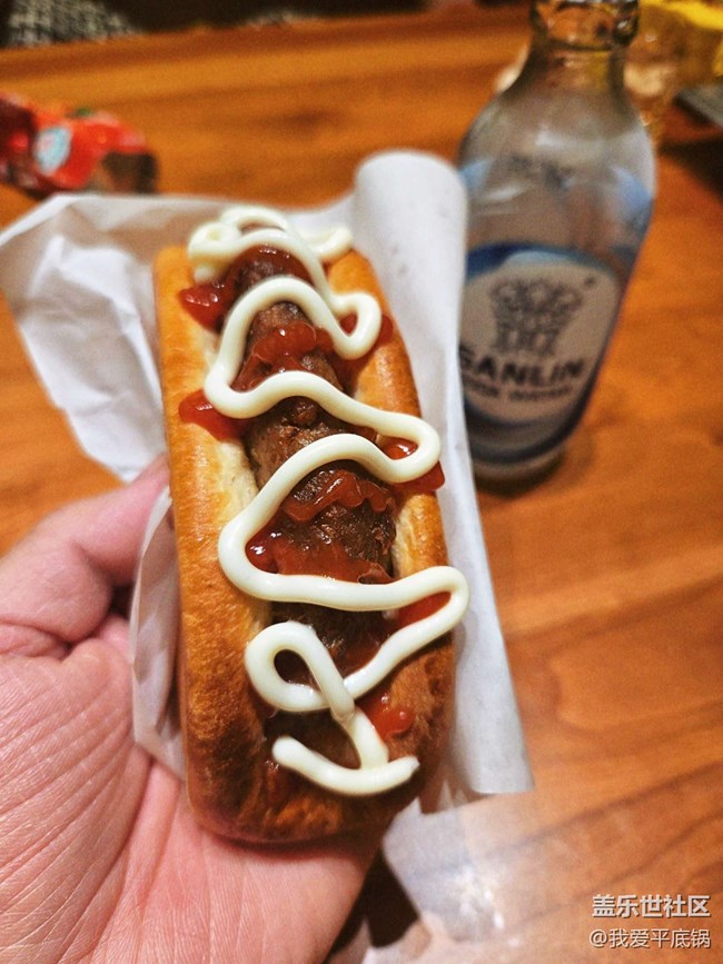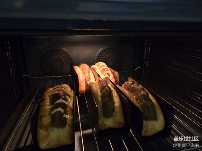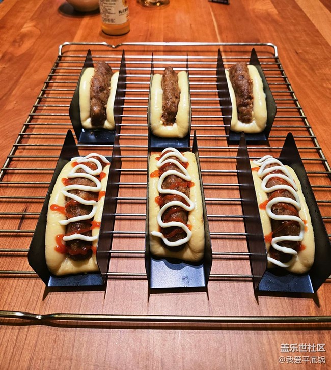 3.取出發(fā)酵好的面包中間放上提前備好的豬扒、表面刷上蛋液、豬扒一側(cè)擠上較粗的沙拉槳,表面擠番茄醬或者黑椒醬,放入烤箱165度烘烤16分鐘(時(shí)間溫度僅供參考,根據(jù)自己烤箱的脾氣來)!