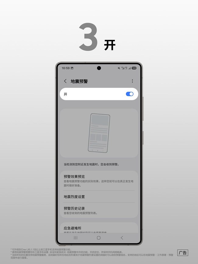 *可升級到One UI6.1.1及以上的三星手機(jī)支持地震預(yù)警功能。