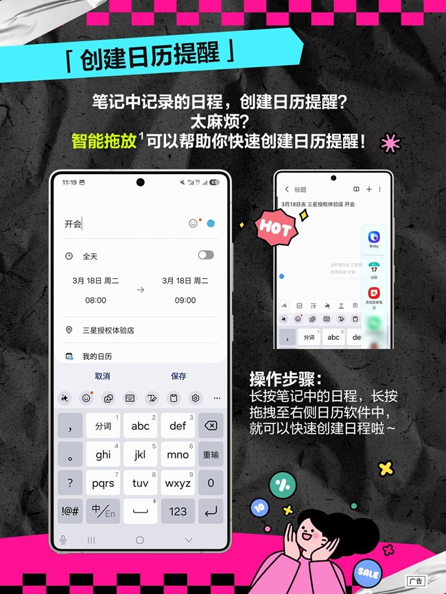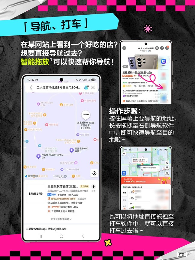 *智能拖放功能需要連接網(wǎng)絡(luò)并登錄三星賬號(hào)?!耙煌洗蜍?chē)”和“一拖導(dǎo)航”服務(wù)需用戶選取包含地址信息的屏幕文本內(nèi)容;“一拖圖文分享”服務(wù)需用戶下載并安裝主流社交應(yīng)用程序??赡芘c某些應(yīng)用程序不兼容,無(wú)法完全保證結(jié)果的準(zhǔn)確性。