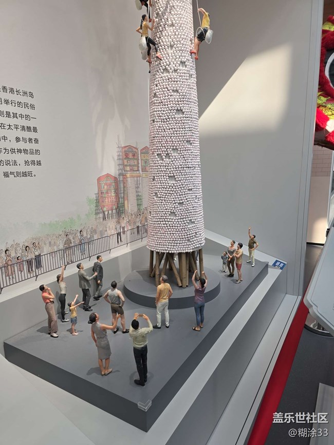 不遠(yuǎn)處,香港長(zhǎng)洲島搶包山的模型尤為震撼。高聳的包山堆滿包子,攀爬的人偶栩栩如生,仿佛能讓人感受到活動(dòng)現(xiàn)場(chǎng)的熱烈與緊張,體會(huì)到當(dāng)?shù)鬲?dú)特的民俗魅力。